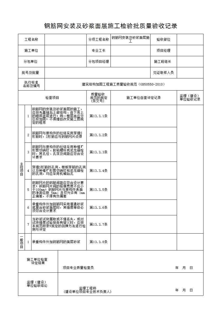 表格名称:钢筋网安装及砂浆面层施工检验批质量验收记录