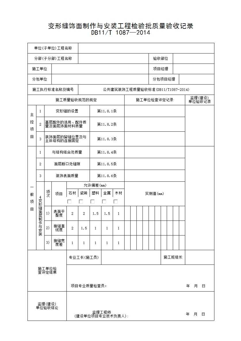 表格名称:变形缝饰面制作与安装工程检验批质量验收记录