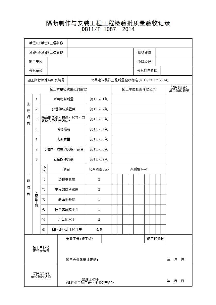 表格名称:隔断制作与安装工程检验批质量验收记录