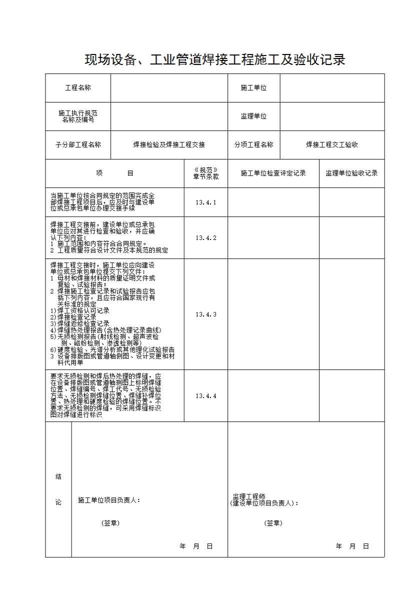 表格名称:焊接检验及焊接工程交接(焊接工程交工验收)