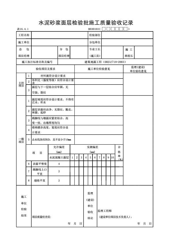 表格名称:水泥砂浆面层检验批施工质量验收记录