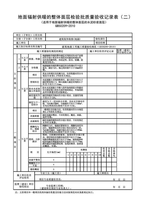 表格名称:地面辐射供暖的整体面层检验批质量验收记录表(二)