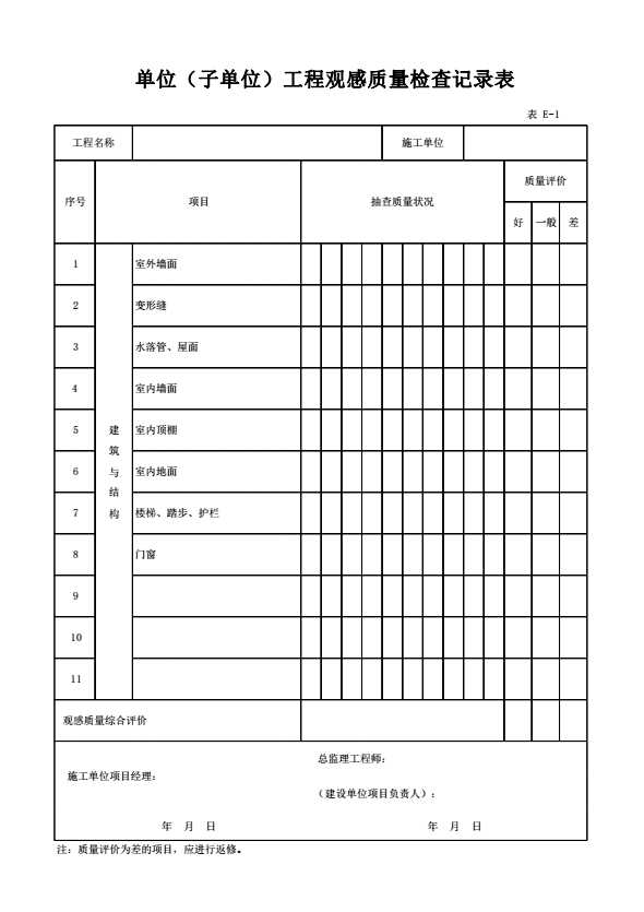 表格名称:单位(子单位)工程观感质量检查记录表E-1