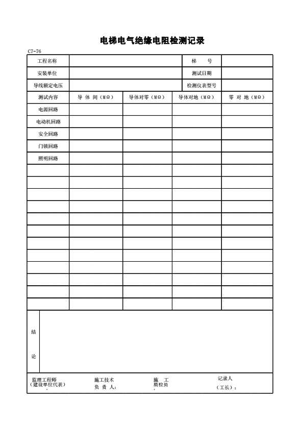 表格名称:C7-76电梯电气绝缘电阻检测记录