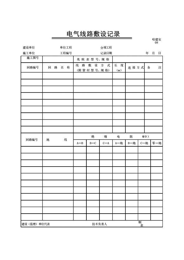 表格名称:哈建安08电气线路敷设记录
