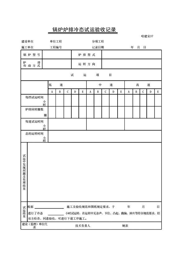 表格名称:哈建安37锅炉炉排冷态试运验收记录