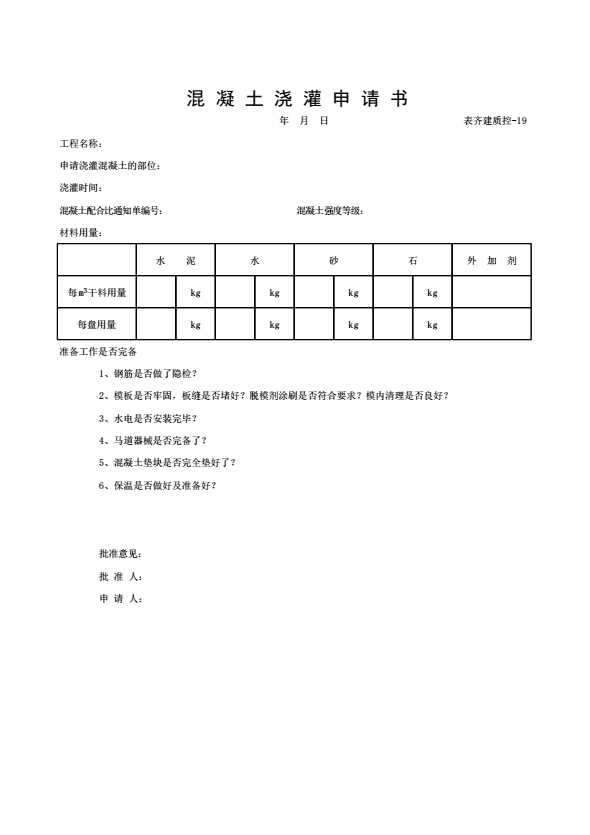 表格名称:表齐建质控-19混凝土浇灌申请书