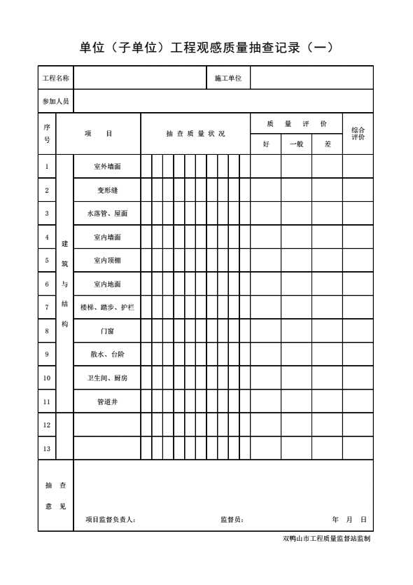 表格名称:单位(子单位)工程观感质量抽查记录(一)