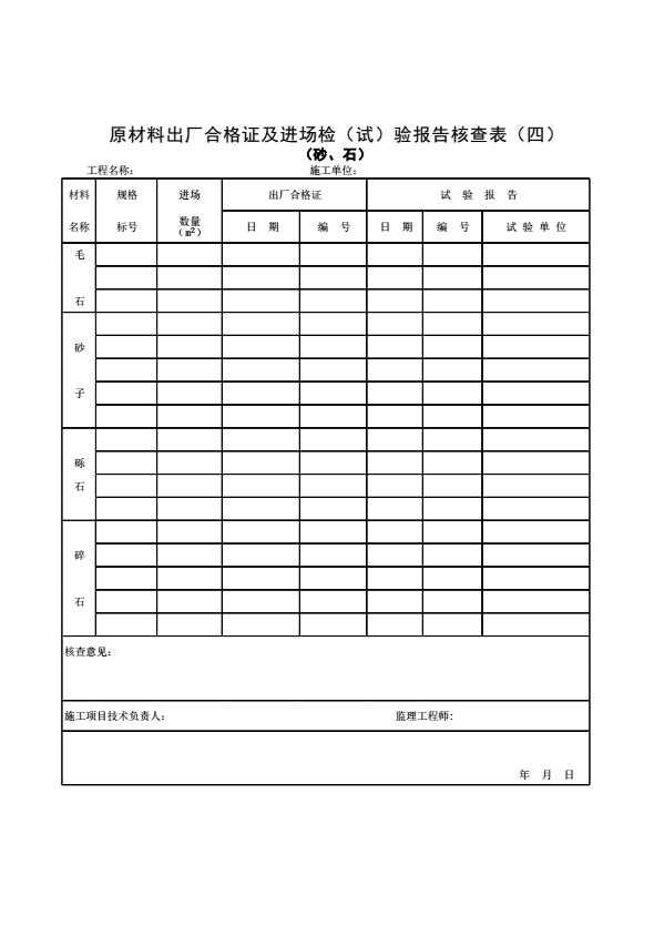 表格名称:原材料出厂合格证及进场检(试)验报告核查表(四)(砂、石)