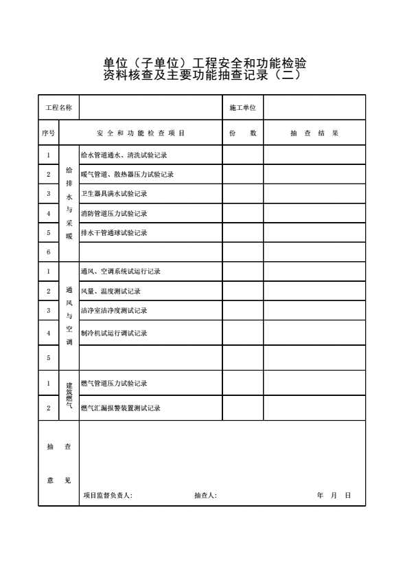 表格名称:单位(子单位)工程安全和功能检验资料核查及主要功能抽查记录(二)