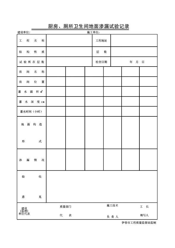 表格名称:厨房、厕所卫生间地面渗漏试验记录
