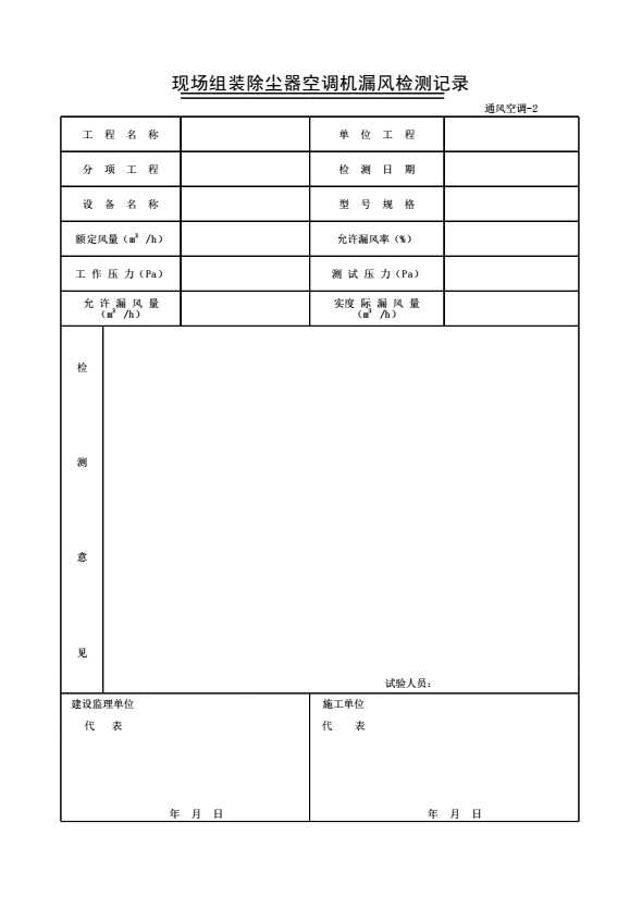 表格名称:通风空调-2现场组装除尘器调机漏风检测记录