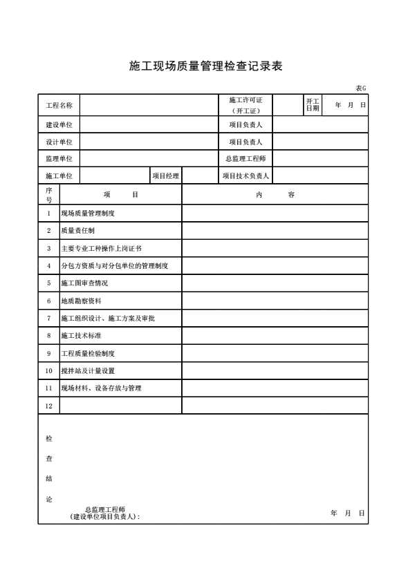 表格名称:施工现场质量管理检查记录表