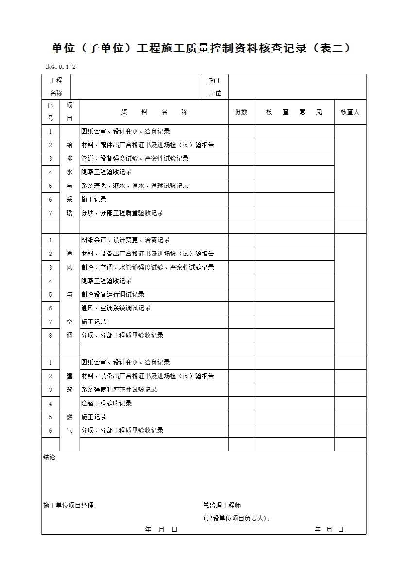 表格名称:单位(子单位)工程施工质量控制资料核查记录(表二)