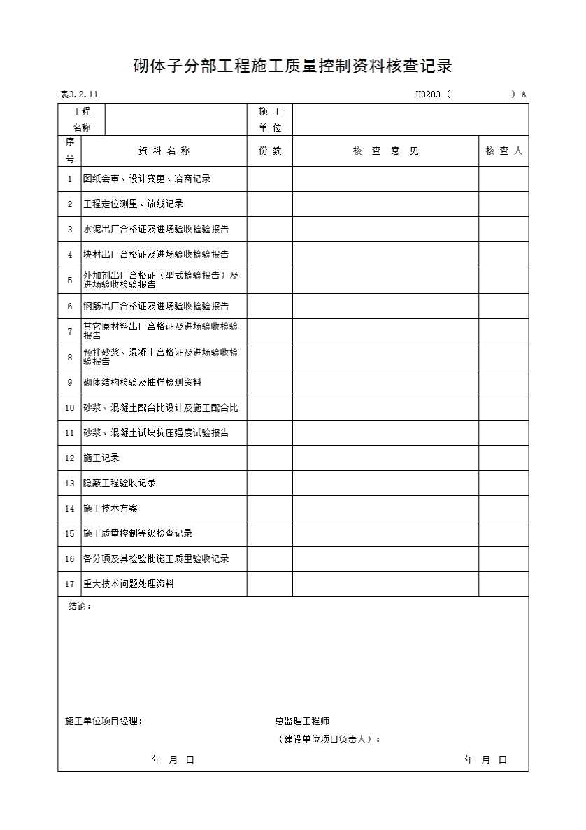 表格名称:砌体子分部工程施工质量控制资料核查记录