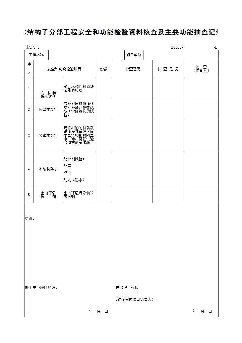 表格名称:木结构子分部工程安全和功能检验资料核查及主要功能抽查记录