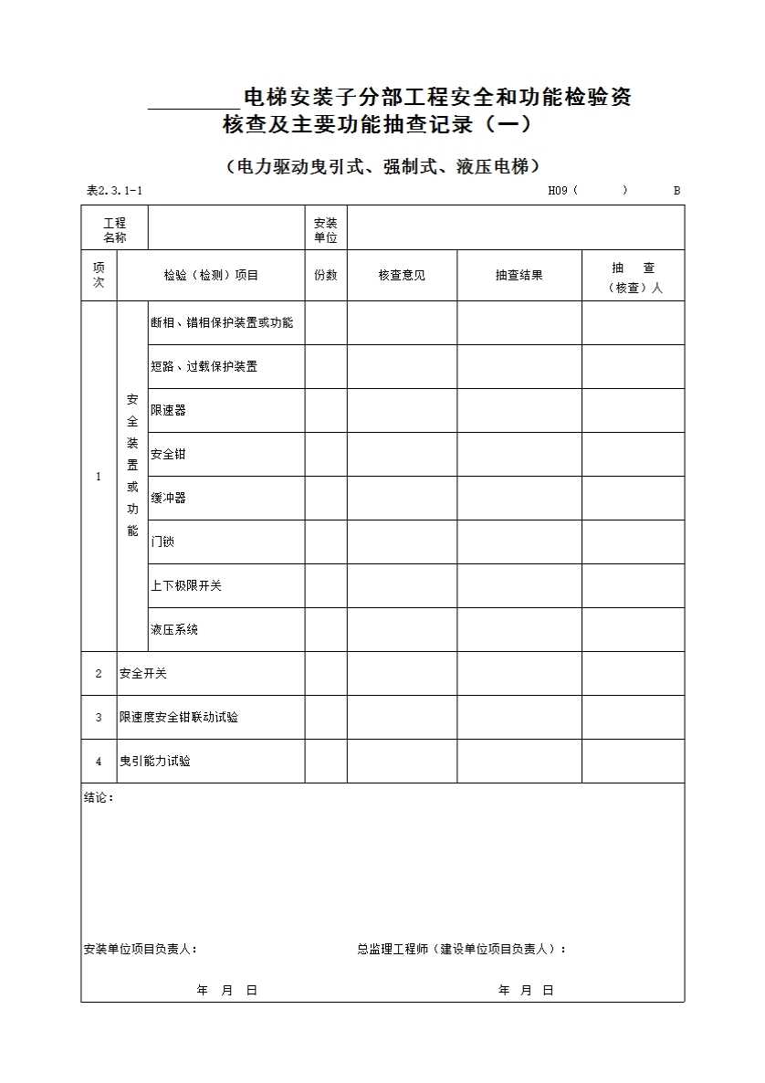 表格名称:液压电梯安装工程子分部安全和功能检验资料核查及主要功能抽查记录(一)