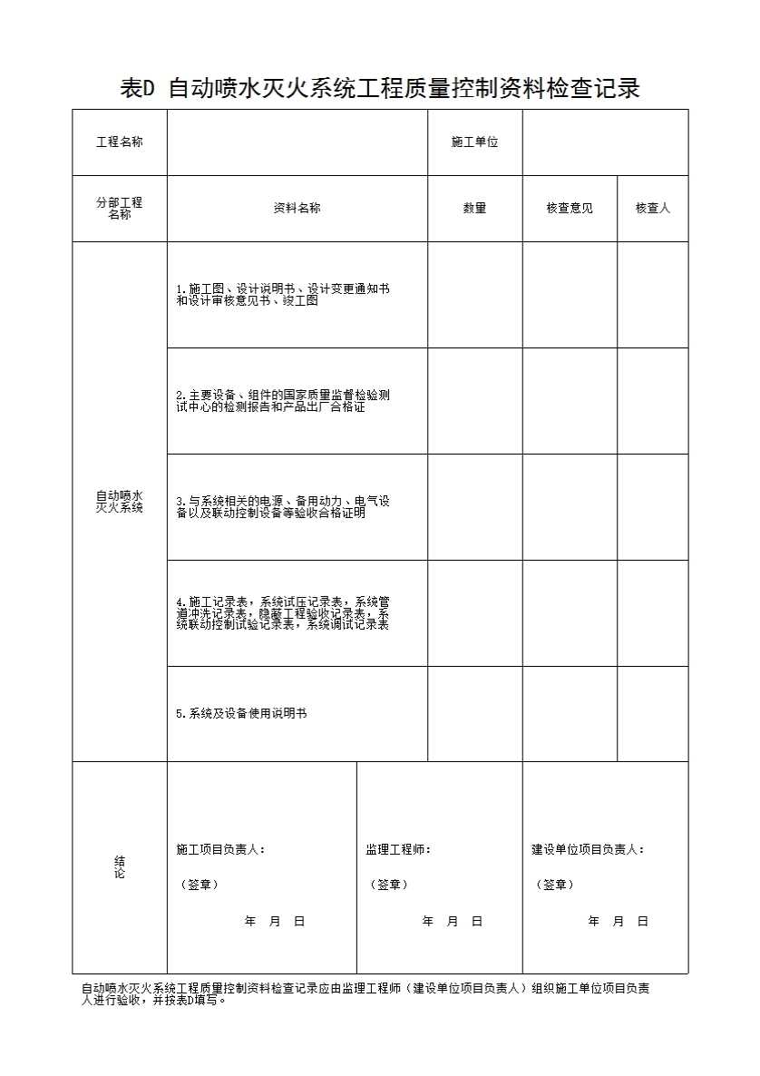 表D 自动喷水灭火系统工程质量控制资料检查记录