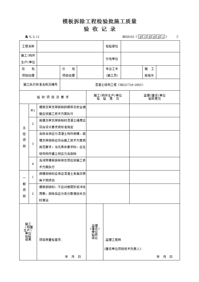 表格名称:模板拆除工程检验批施工质量验收记录