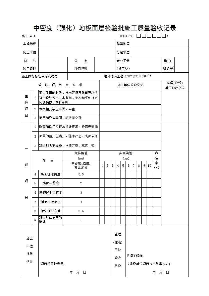 表格名称:中密度(强化)地板面层检验批施工质量验收记录
