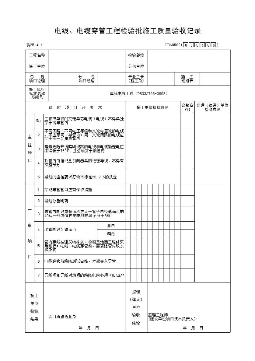表格名称:电线、电缆穿管工程检验批施工质量验收记录