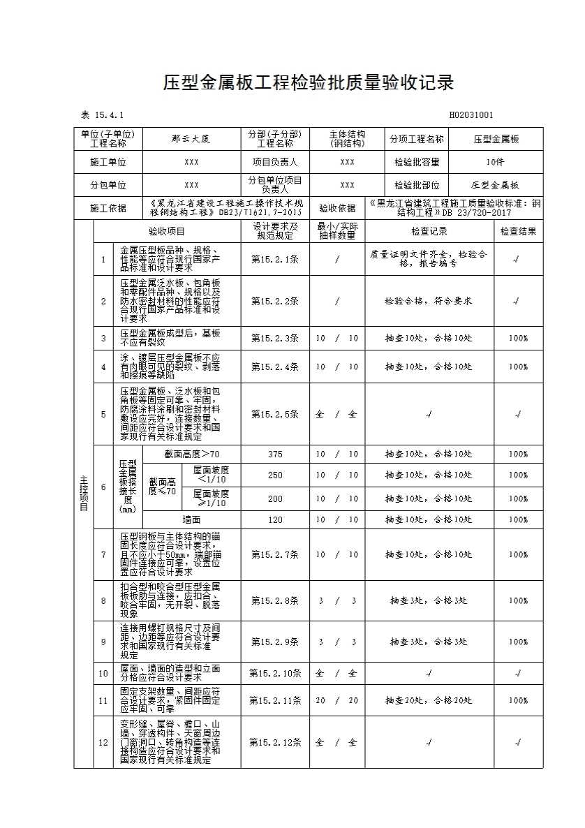 15.2.1 金属压型板及制造金属压型板所采用的原材料,其品种、规格、性能等应符合现行国家产品标准和设计要求。