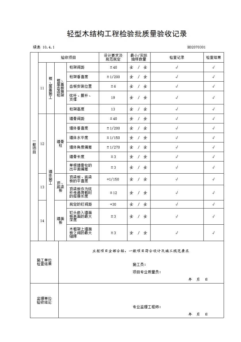 一、轻型木结构工程检验批的划分应按照同一建筑项目同期施工的每幢建筑面积不超过300m2、总建筑面积不超过3000m2的轻型木结构建筑为一检验批,不足3000m2者应视为一个检验批,单体建筑面积超过300m2时,应单独视为一个检验批,轻型木结构制作安装质量控制应以一幢房屋的一层为一检验批。