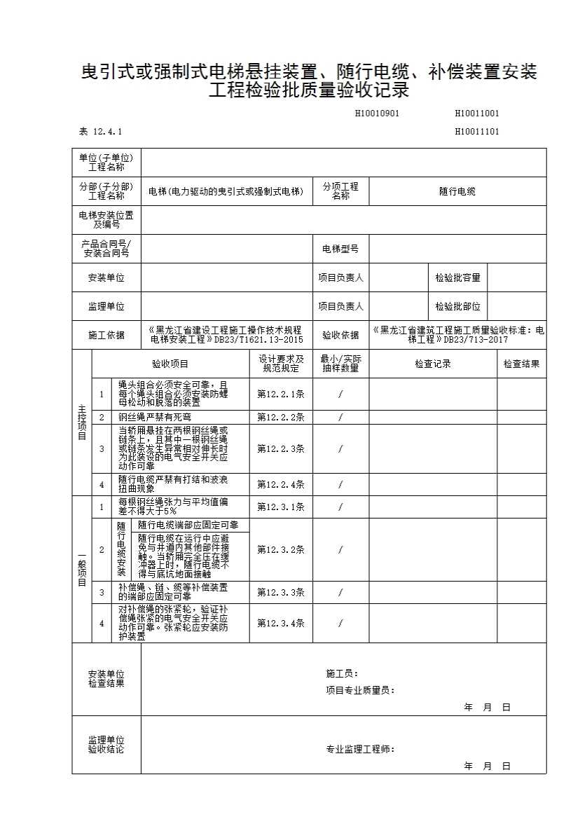 H10011001_曳引式或强制式电梯悬挂装置、随行电缆、补偿装置安装工程检验批质量验收记录.