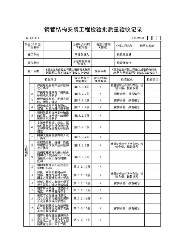 一、网架、网壳结构及钢管桁架结构的安装工程可按变形缝或空间刚度单元等划分成一个或若干个检验批,或者按照楼层或施工段等划分为一个或若干个检验批。