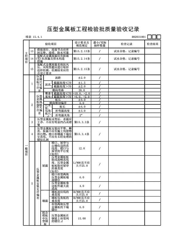 15.2.1 金属压型板及制造金属压型板所采用的原材料,其品种、规格、性能等应符合现行国家产品标准和设计要求。