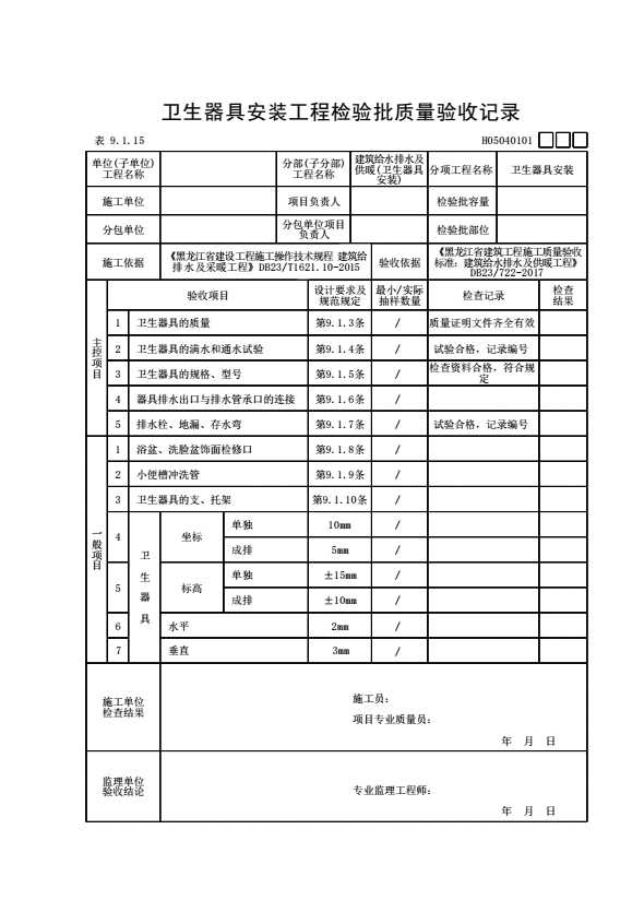 卫生器具安装工程检验批施工质量验收