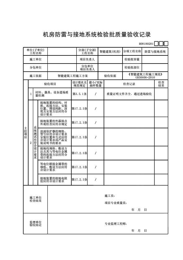 H08180201 机房防雷与接地系统检验批质量验收记录