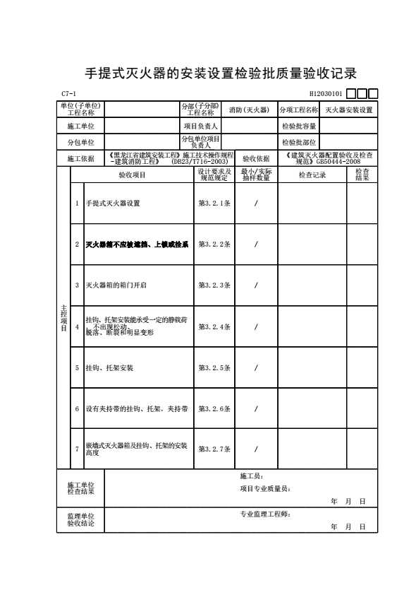 表格名称:H12030101 手提式灭火器的安装设置检验批质量验收记录