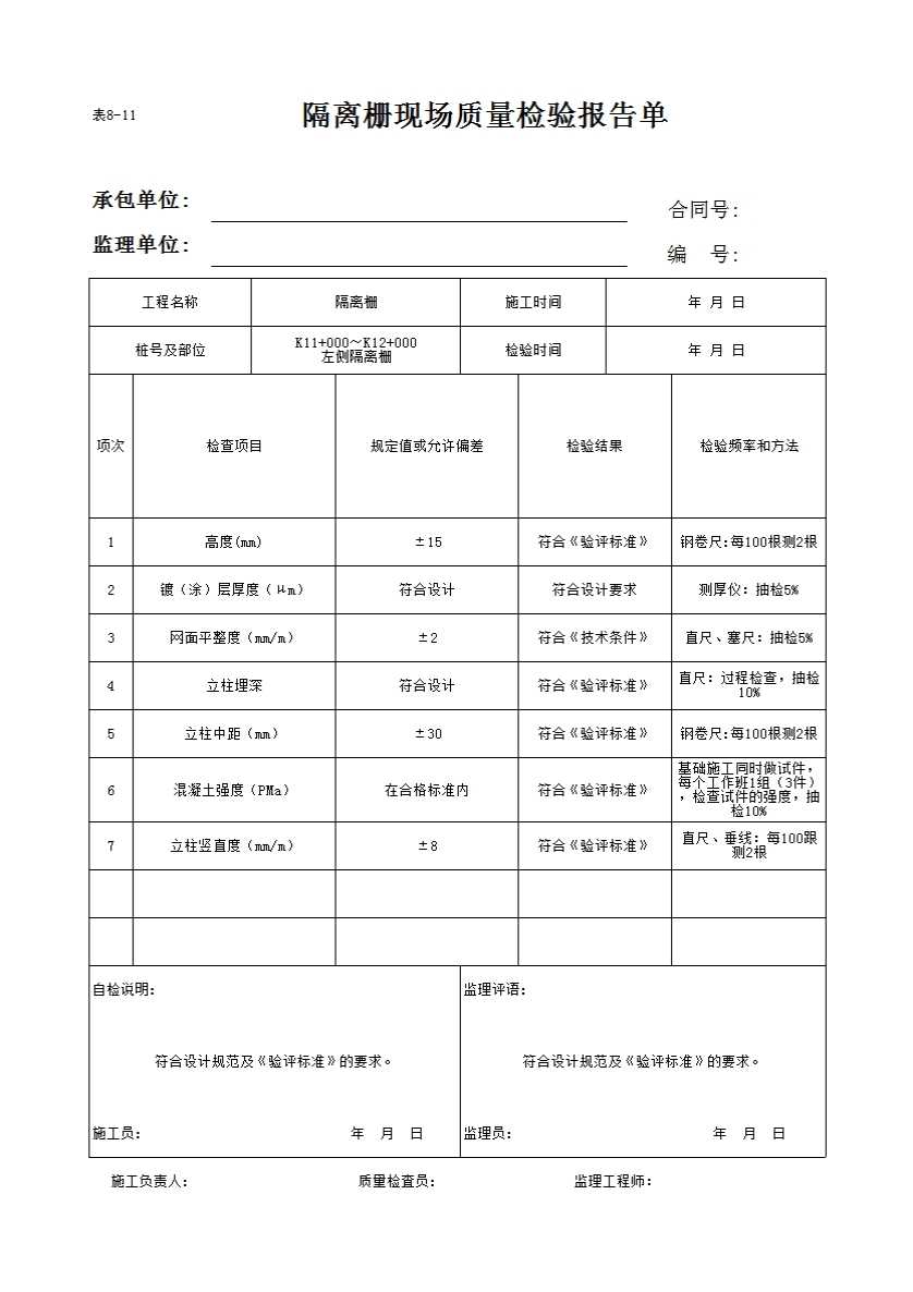 表格名称:表8-11 隔离栅现场质量检验报告单