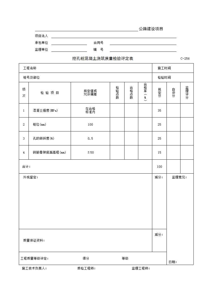 表格名称:C-256 挖孔桩混凝土浇筑质量检验评定表