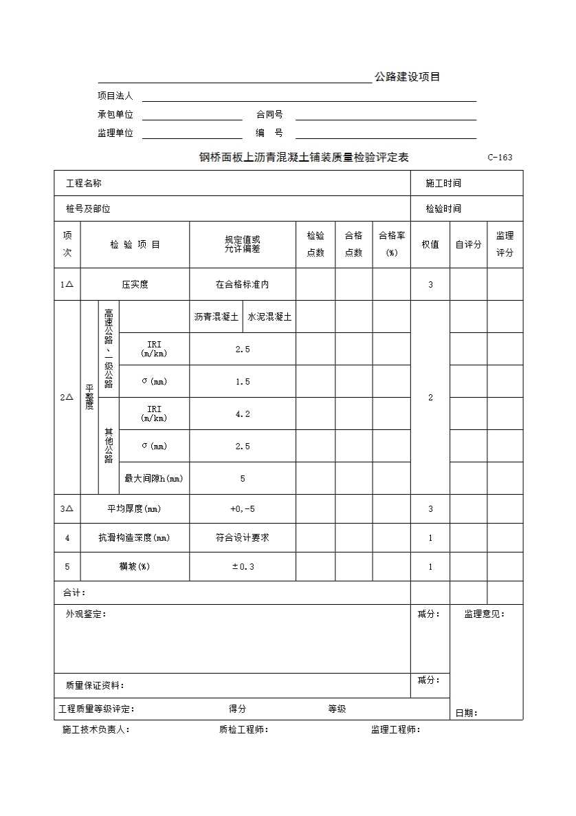 表格名称:C-163 钢桥面板上沥青混凝土铺装质量检验评定表
