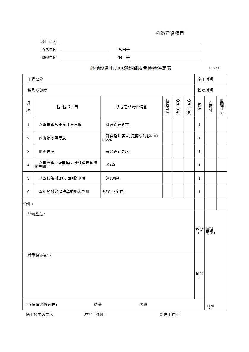 表格名称:C-241 外场设备电力电缆线路质量检验评定表