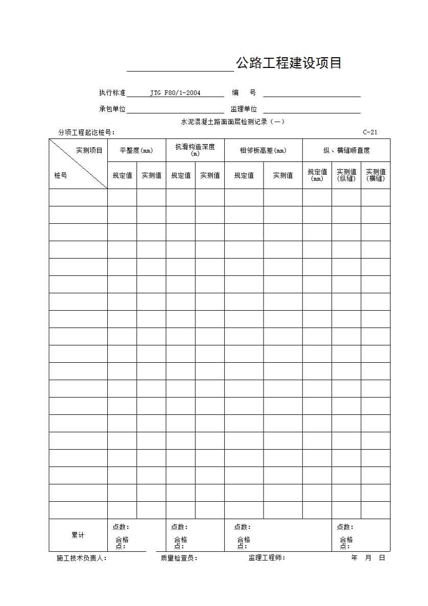 表格名称:C-21表 水泥混凝土路面面层检测记录(一)