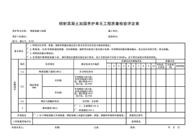 表格名称:喷射混凝土加固养护单元工程质量检验评定表