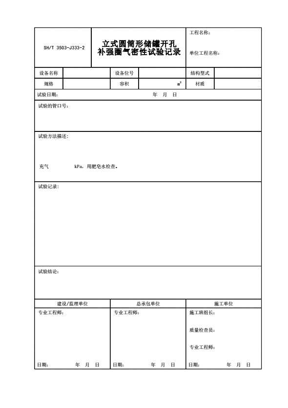SH/T 3503-J333-2 立式圆筒形储罐开孔补强圈气密性试验记录