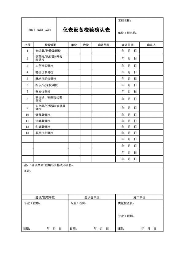 表格名称:SH/T 3503-J601 仪表设备校验确认表