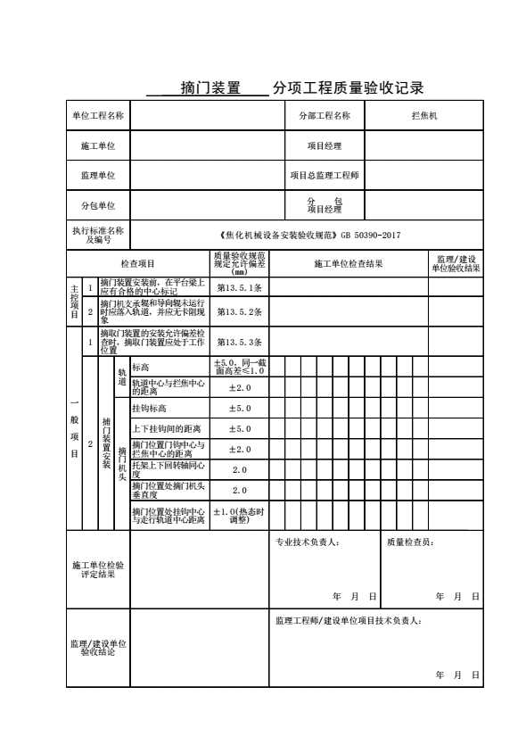 表格名称:摘门装置分项工程质量验收记录