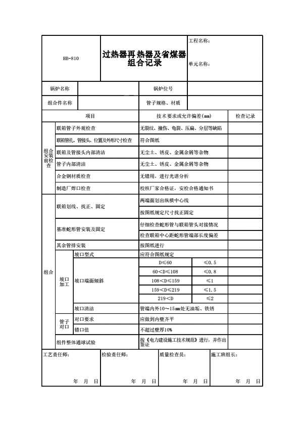 表格名称:HB-810 过热器再热器及省煤器组合记录