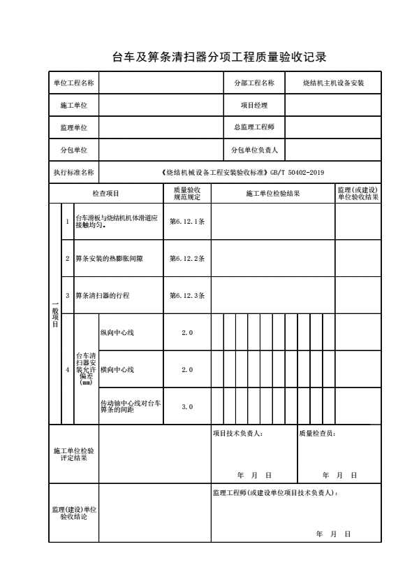 表格名称:台车及箅条清扫器分项工程质量验收记录