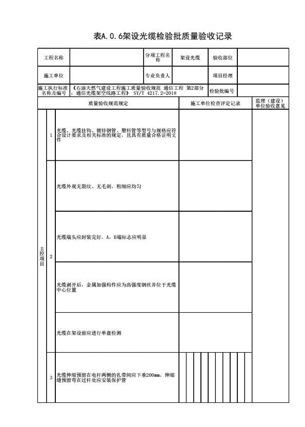 表格名称:表A.0.6 架设光缆检验批质量验收记录