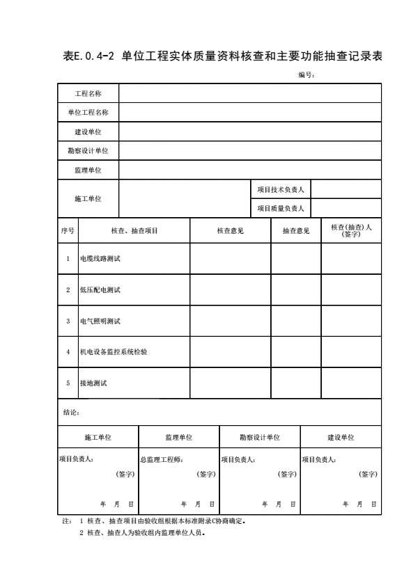 表E.0.4-2 单位工程实体质量资料核查和主要功能抽查记录表