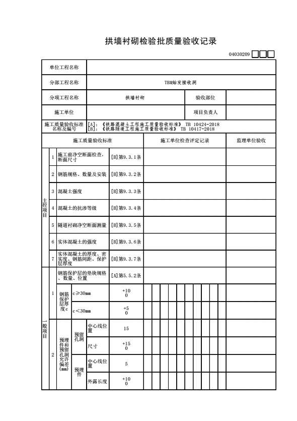 表格名称:04030209 拱墙衬砌检验批质量验收记录