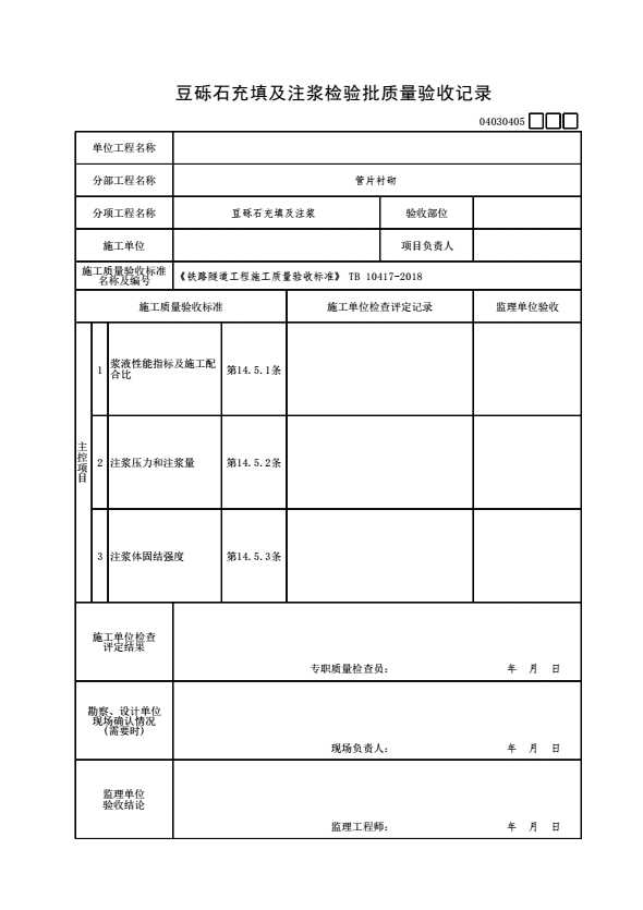 表格名称:04030405 豆砾石充填及注浆检验批质量验收记录