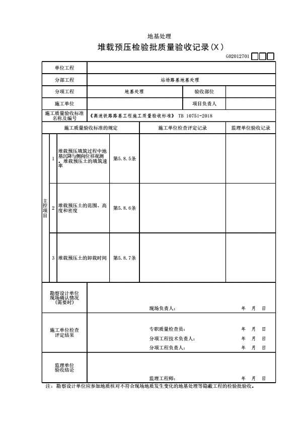 表格名称:G02012701 【地基处理】堆载预压检验批质量验收记录(Ⅹ)
