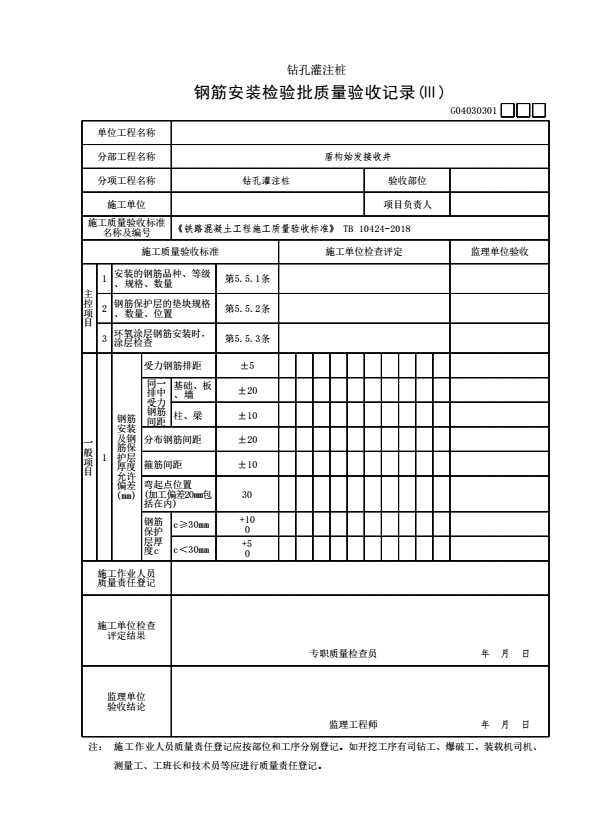 表格名称:G04030301 【钻孔灌注桩】钢筋安装检验批质量验收记录(Ⅲ)